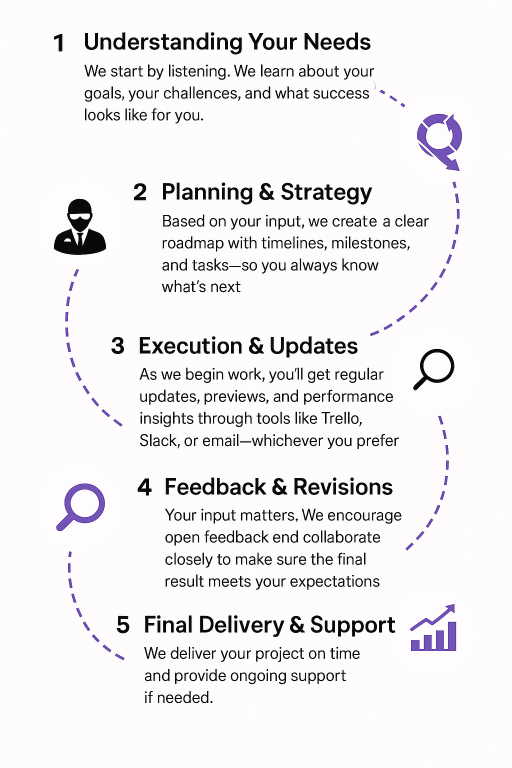 We believe in clear communication, timely updates, and no surprises. That’s why we use easy-to-follow project management tools, regular check-ins, and detailed progress reports to keep you informed at every stage.